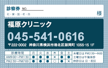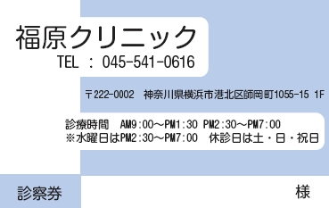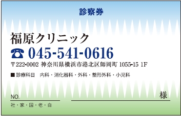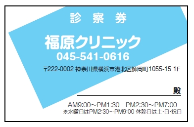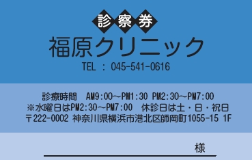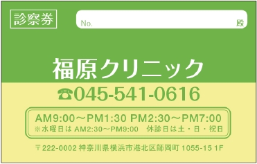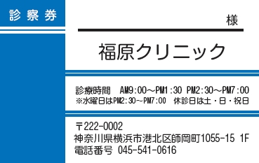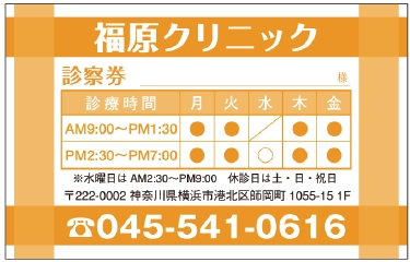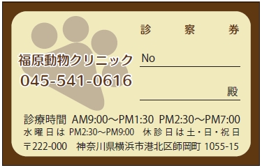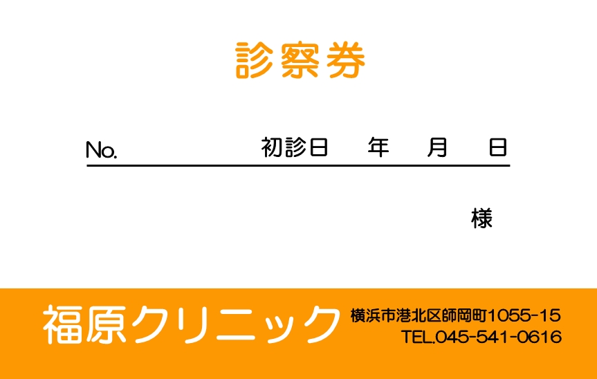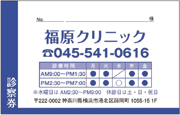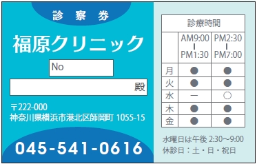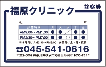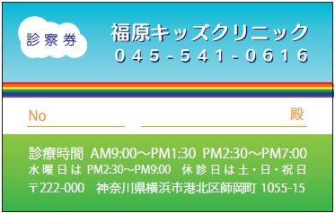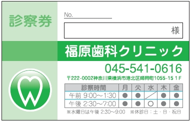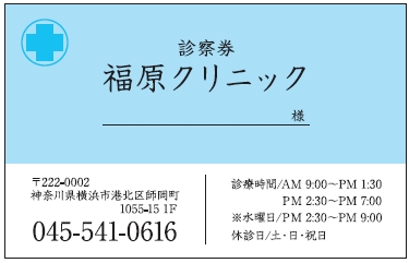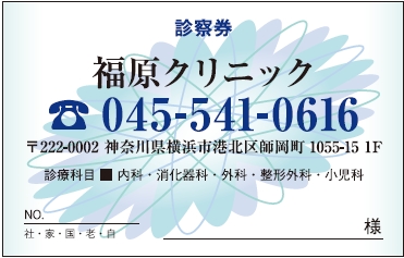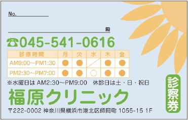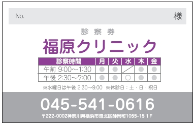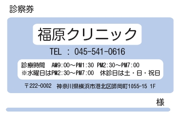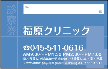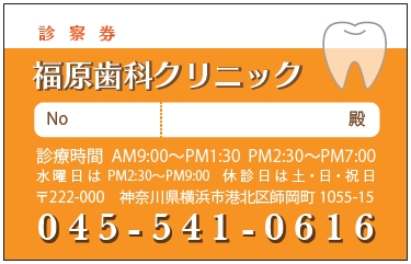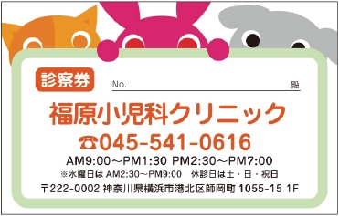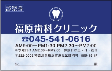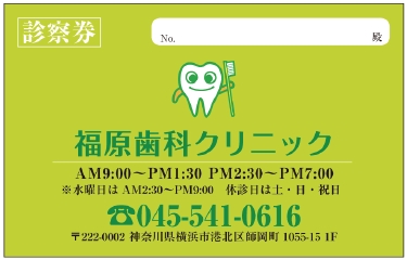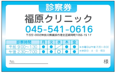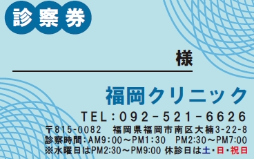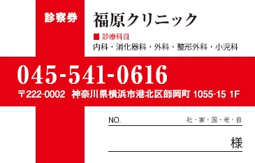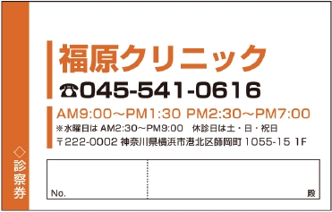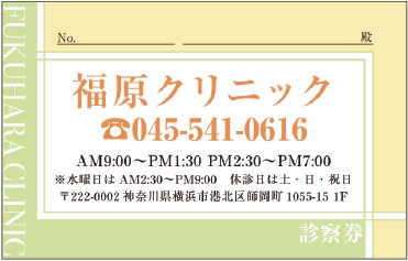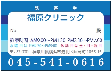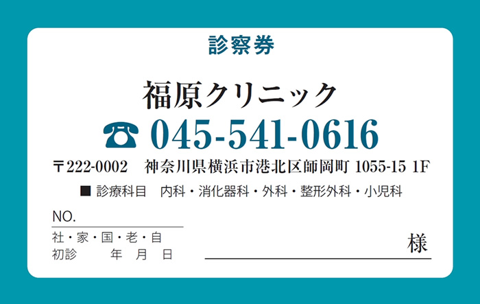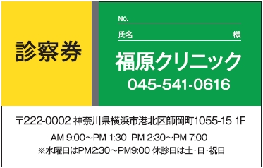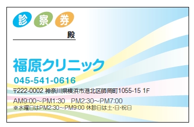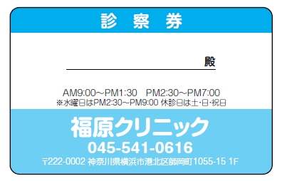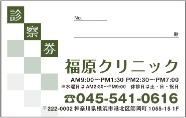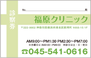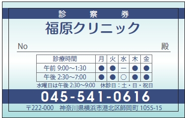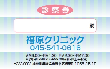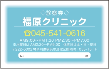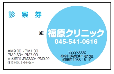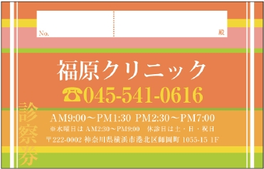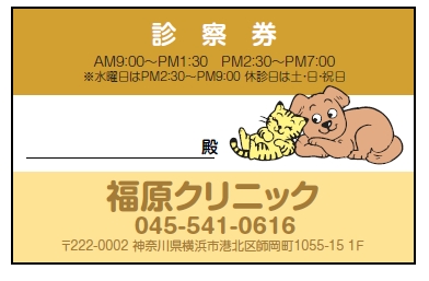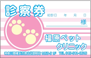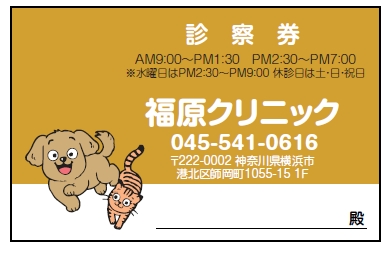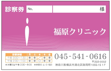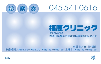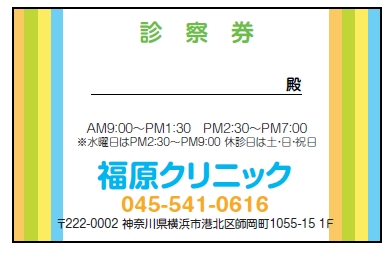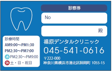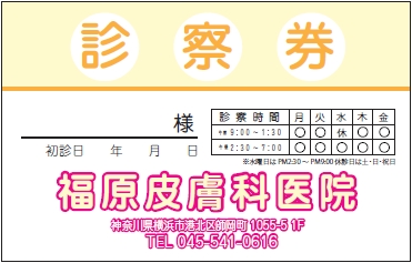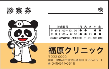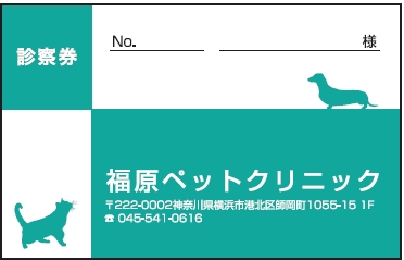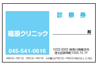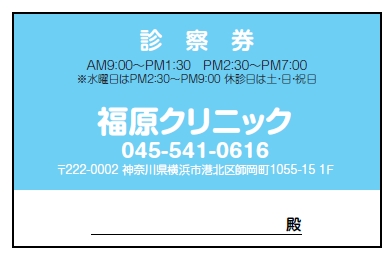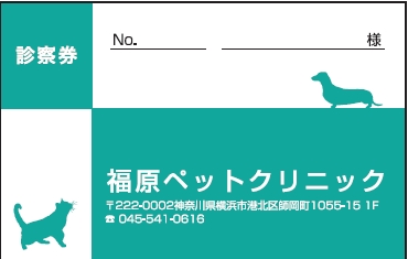 ※当社に許可(許可証)なく、診察券のデザインの一部または全てを複写・転用・利用することは一切禁止です。上記デザインは当社の著作権により完全に保護されております。例えば、これらデザインの一部または全てを他社で印刷・製作される事も著作権法違反になる可能性がございますので、十分ご注意ください。